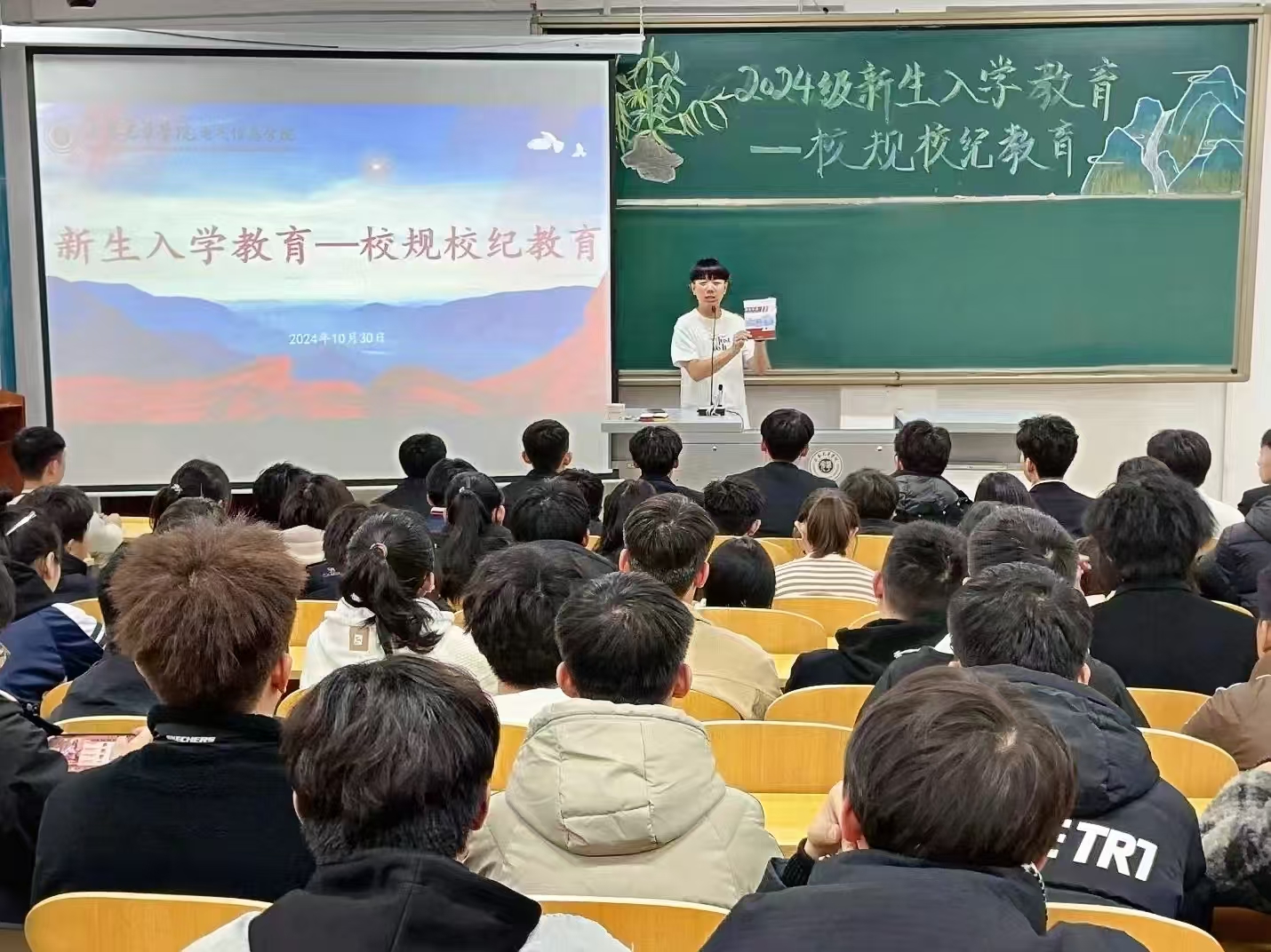 为尽快帮助2024级新同学们完成角色转变,树立制度意识和纪律意识,促进基础文明好习惯的养成,2024年10月30日,best365足球官网在二教318教室召开新生入学教育之“校规校纪教育”主题讲座。本次讲座由best365足球官网辅导员曲相日主讲,2024级全体学生参加。辅导员曲相日对《长春光华学院2024年学生手册》进行了详细解读,对学生日常管理、宿舍管理、基础文明、违纪处理流程等方面进行了细致深入地讲解,着重强调了旷课、晚归、考试违纪、寝室内使用违章电器、寝室内饲养小动物等行为导致的严重后果。结合实际案例对学生学习、生活和校园管理等方面的要求进行了说明和强调。此次主题讲座,进一步深化宣传了校规校纪教育,让2024级新同学们学纪、知纪、明纪、守纪,做到心有所畏、言有所戒、行有所止,确保校规校纪教育工作真正落地生根、发挥实效。