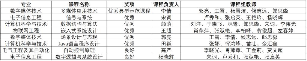 2024-2025第二学期,我校各专业共计67门课程参加了课程建设质量评价,best365足球官网组织8门课程参加了此次评价,最终经专家组复评获评6门优秀课程(全校共26门)、2门良好课程,其中“多媒体应用技术”课程获评“优秀典型示范课程”。best365足球官网获得“优秀组织奖”。具体获奖课程如下: