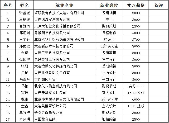 2019届东软集团校企合作数字媒体技术专业就业汇总表(2019年5月)